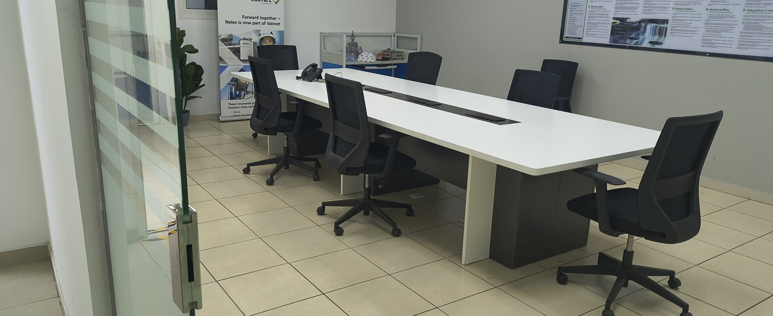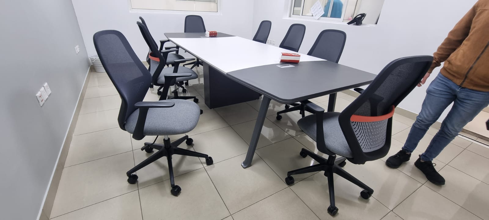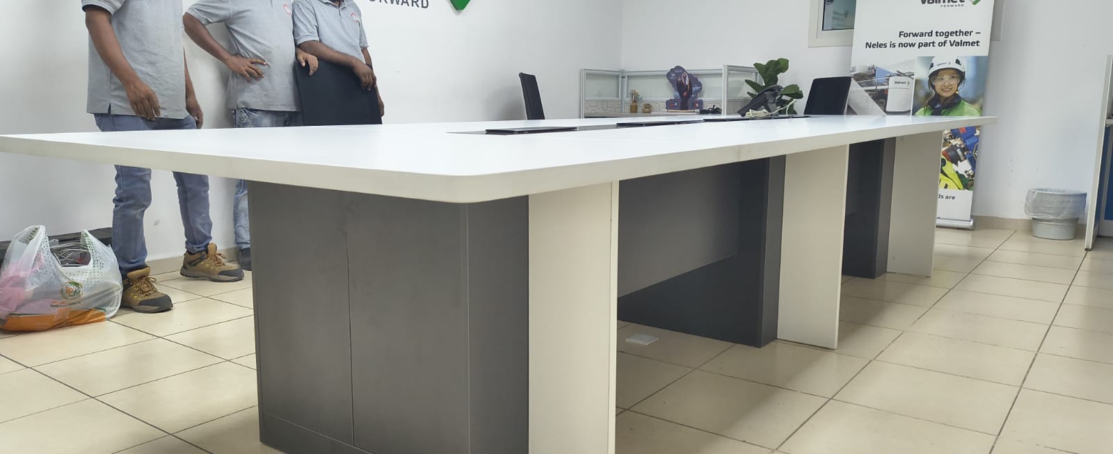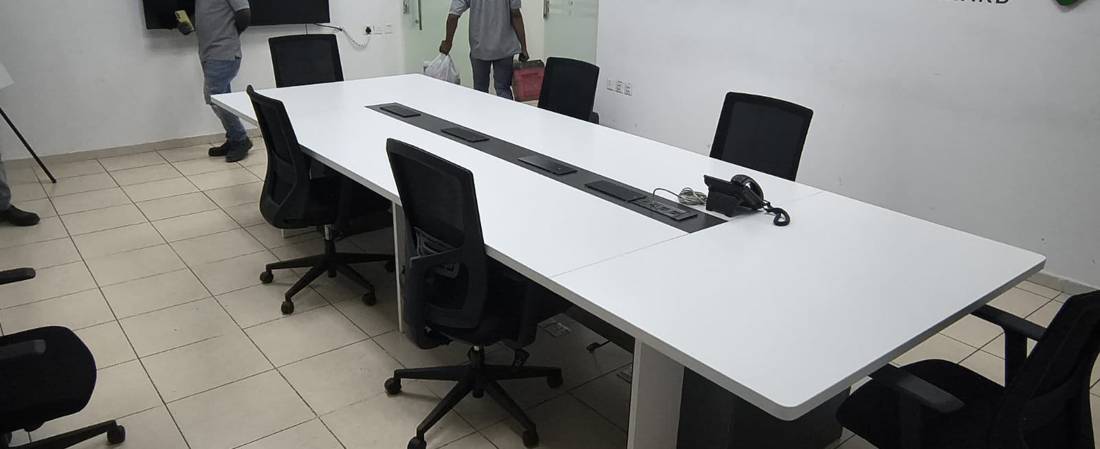 A durable and elegant wooden office meeting table designed for boardrooms and conference spaces, offering ample seating and a professional finish to enhance any workspace.